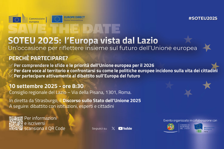 Nell’ambito di questa iniziativa, Europe Direct Roma Innovazione organizza, in collaborazione con il Consiglio regionale del Lazio e il Movimento Europeo in Italia l’evento: “SOTEU 2025: l’Europa vista dal Lazio” per seguire in diretta il discorso della Presidente della Commissione europea da Strasburgo e, successivamente, avviare un confronto e un dibattito con rappresentanti istituzionali, esperti e cittadini, con la possibilità di esprimere le proprie opinioni, fare domande e condividere le proprie prospettive su come plasmare il futuro dell’Unione europea.